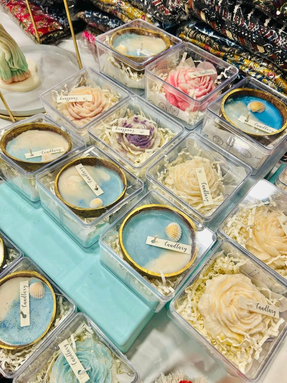 A beautiful handcrafted candle infused with lavender essential oils in a gold crusted coconut shell