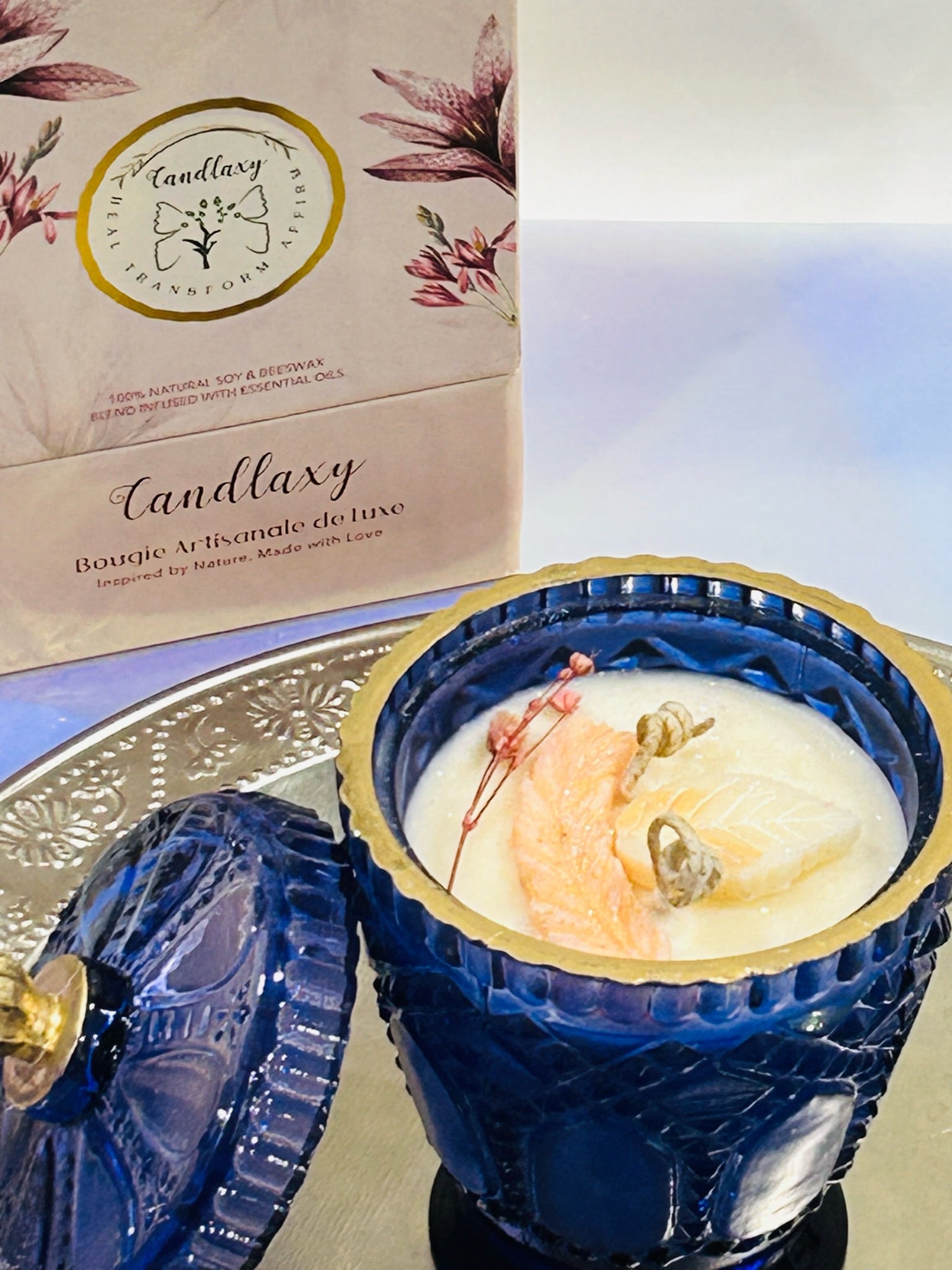 A limited edition blue crystal jar made with soy and beeswax infused with blend of essential oils with key notes of lavender