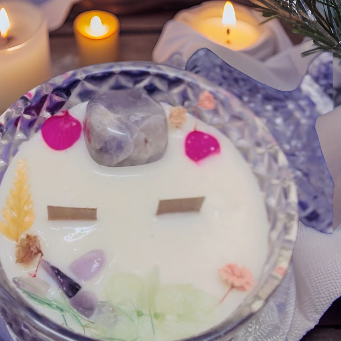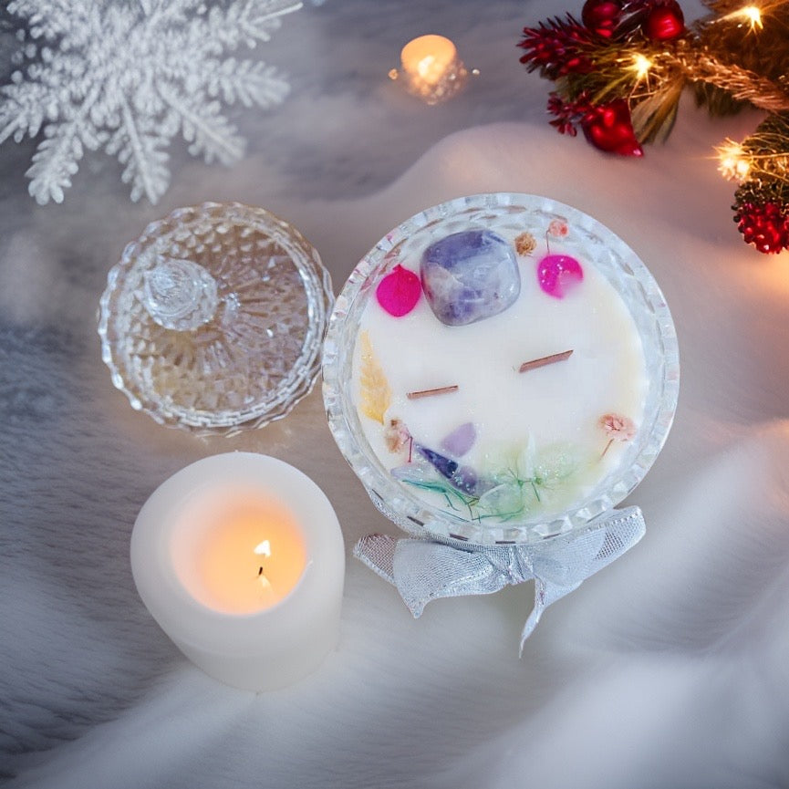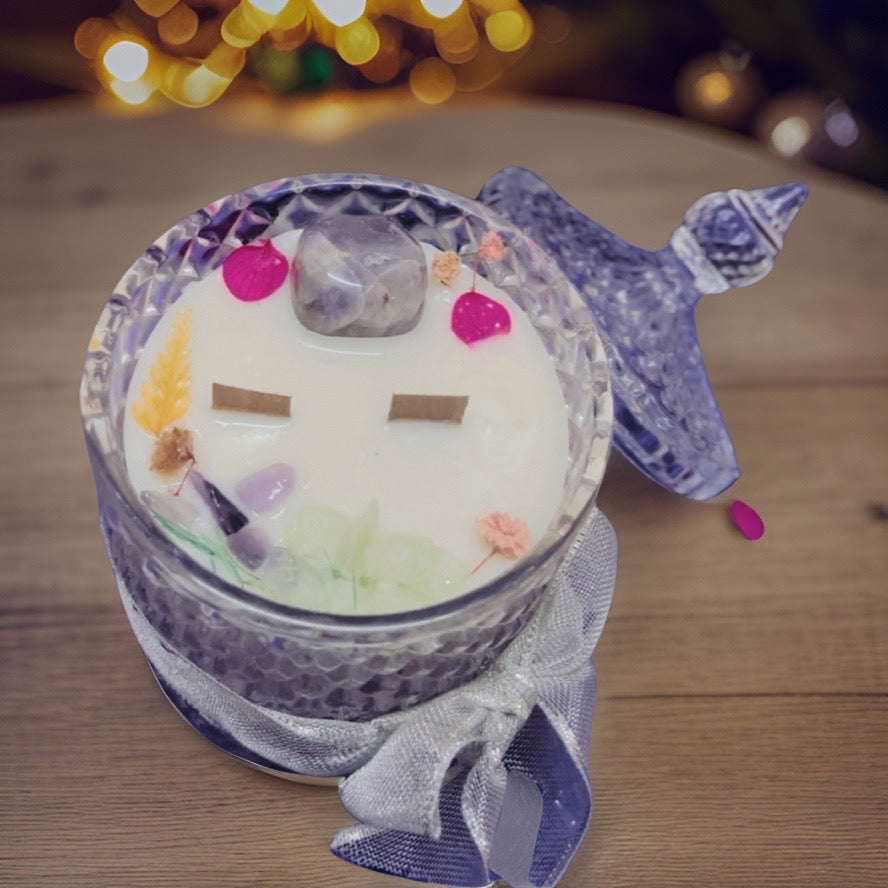 A premium diamond cut crystal jar with soy and bees wax blend infused with healing crystal Amethyst